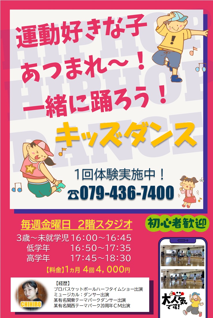 『HIPHOP』を中心とした教室です。HIPHOPは「アップ」と「ダウン」でリズムをとるのが特徴で、様々なダンスの要素が取り入れられています。集団の中で協働や協調が図られるダンスの教室は、リズム感・ダンス技術・自己表現力とともに自己肯定感や自信の構築にも繋がります。音楽が好き🎵身体を動かす💪ことが好きなお子様にオススメ🍀基本の動作から応用までわかりやすく指導を行うので、ダンスがはじめてのお子様も、今まで違うジャンルのダンスをしていたお子様も、安心して楽しくご参加いただけます。この機会にぜひ挑戦してみてください💪キッズダンスは2階スタジオで行います。保護者の方はスタジオ内に入ってお子様の練習風景を見学していただけます。1回体験も実施中🙌😍お気軽にお問い合わせください☎ ※大人気教室となります。空き状況をお電話にてご確認ください。