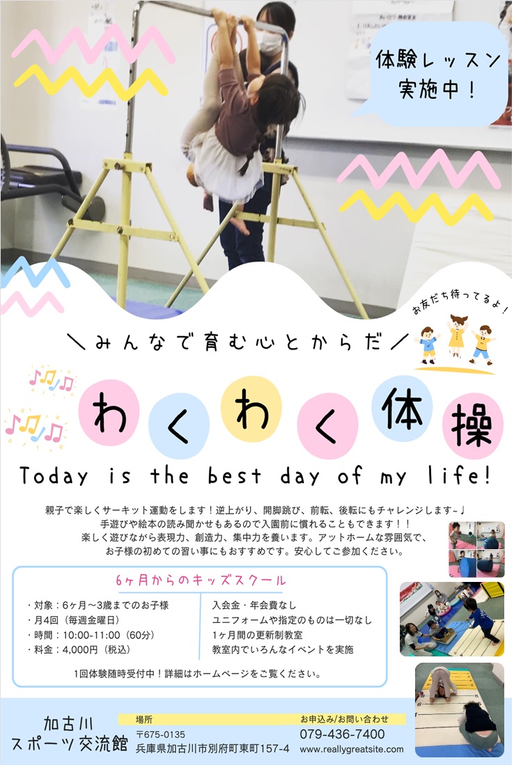 マット運動や、バランスディスク・キッズ用の鉄棒など様々な道具を使用して『歩く』・『走る』・『跳ぶ』の基本動作を中心とした『身体感覚』を養っていきます!逆上がり・前転・後転にもチャレンジ♪♪親子で楽しくサーキット運動もします。保護者同士のコミュニケーション作りの場にも最適💛また、手遊びや絵本の読み聞かせもあるので入園前に慣れることもできます。1ヶ月間の更新制なので無理なく続けることができるので兄妹揃ってなど、対象年齢外のお子様はご相談ください。1回体験も実施中🎶お気軽にお問い合わせください☎ 加古川スポーツ交流館のInstagramに教室風景投稿しています❗※大人気教室となります。空き状況をお電話にてご確認ください。