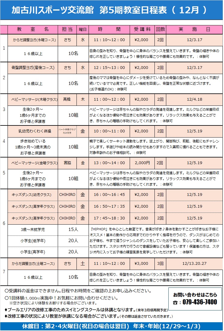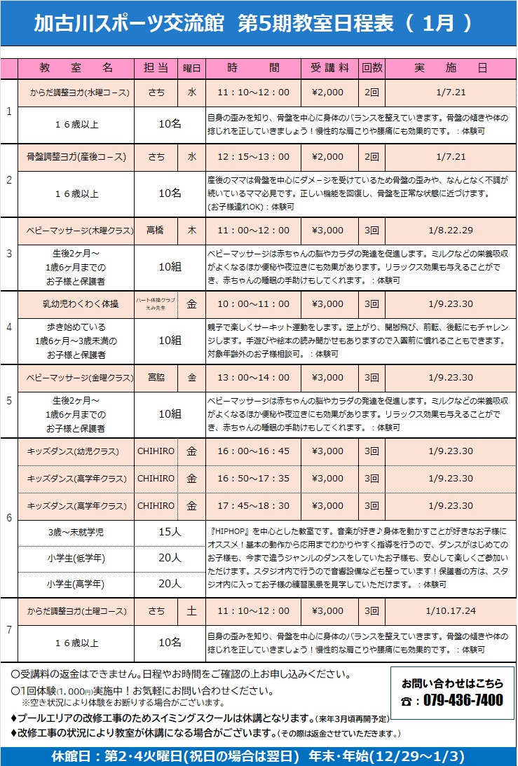 A.キッズダンス、ベビーマッサージ、ヨガ教室などさまざまなスクールを実施しています。1回体験(1,000)もできるのでお気軽に加古川スポーツ交流館までお問い合わせください。