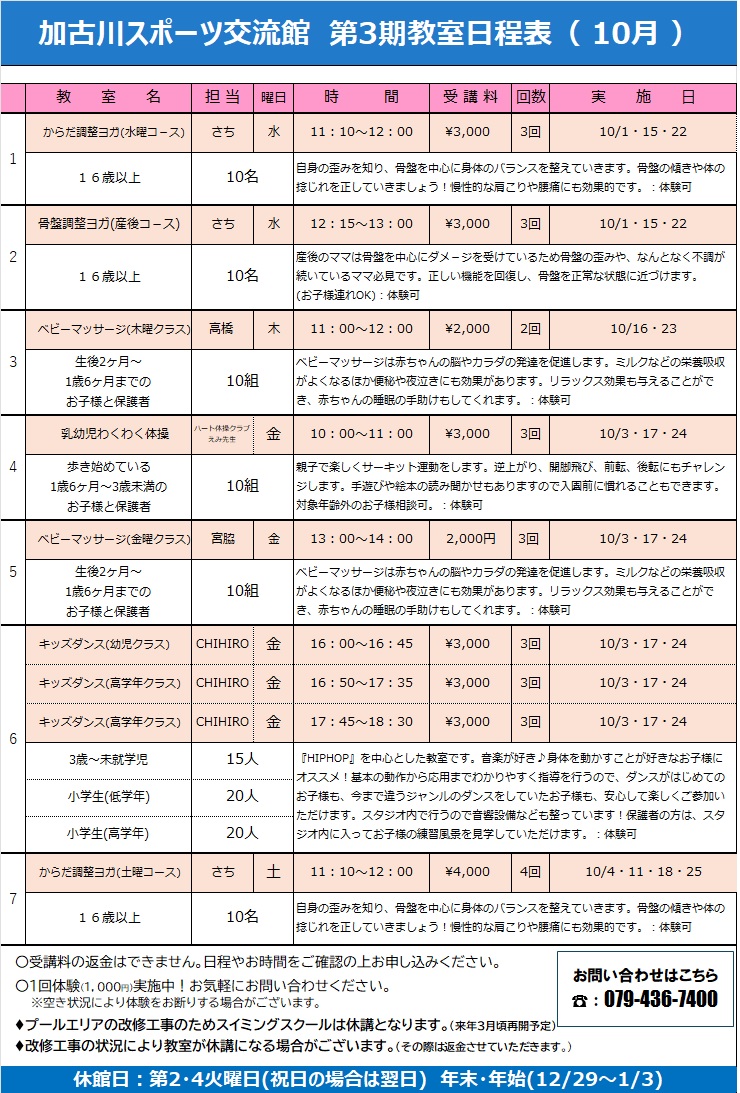 A.キッズダンス、ベビーマッサージ、ヨガ教室などさまざまなスクールを実施しています。1回体験(1,000)もできるのでお気軽に加古川スポーツ交流館までお問い合わせください。