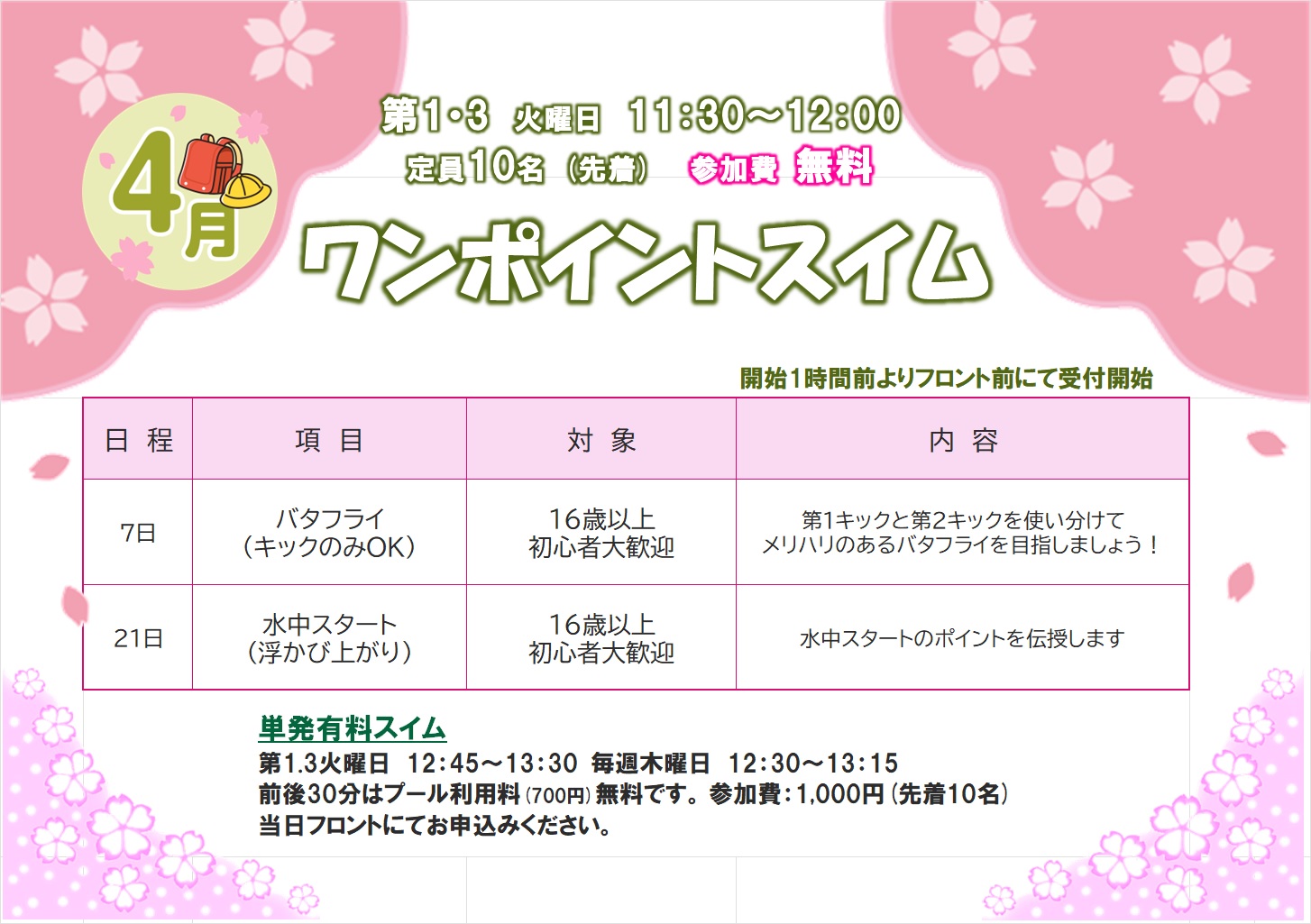 ワンポイントスイムとは日程によって決まった泳法にスポットを当て、より細かく参加者の方にアドバイスをしていくプールレッスンです🏊♂️