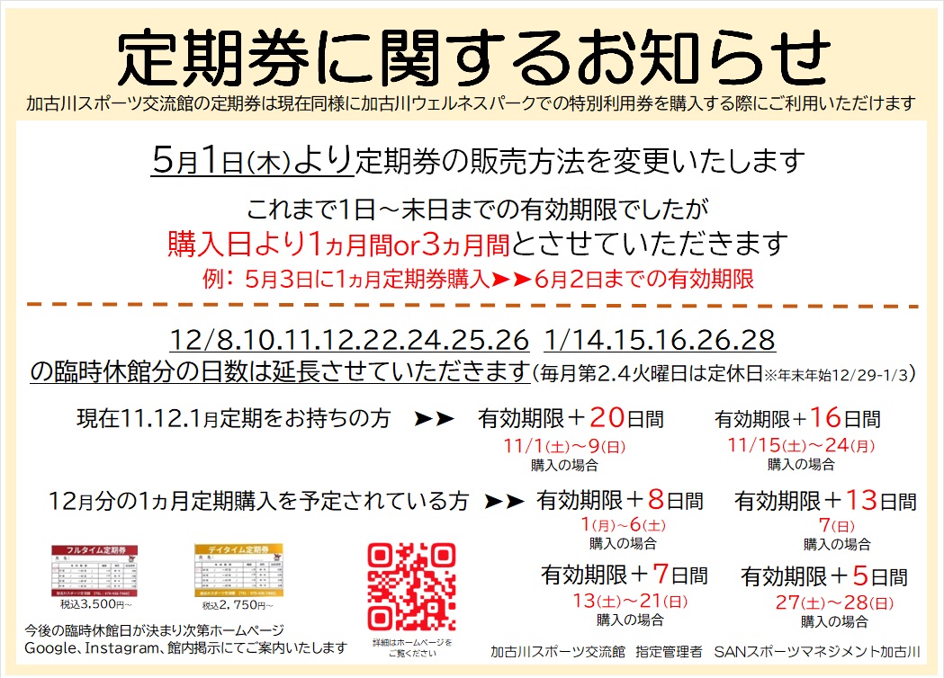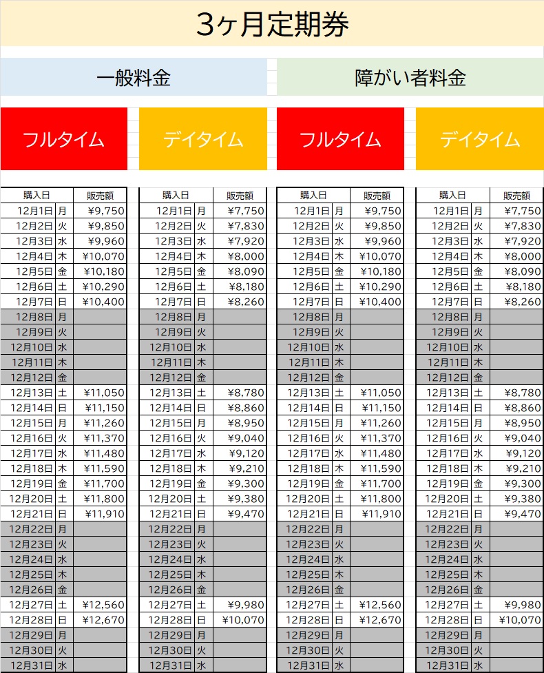 12月・1月・2月臨時休館分は下記料金そのままで延長させていただきます。