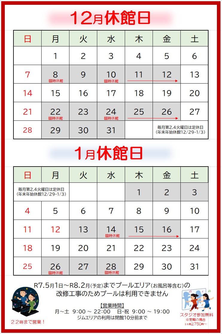 2025年5月1日(木)より実施のプールエリア等の改修工事に伴い、12月・1月の全館休館についてお知らせいたします。(毎月第2.4火曜日は定休日※この日が祝日の場合は翌日 年末年始休館12/29-1/3)