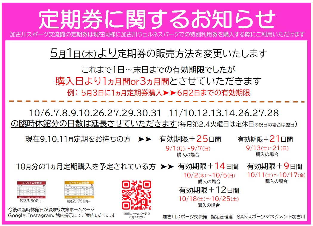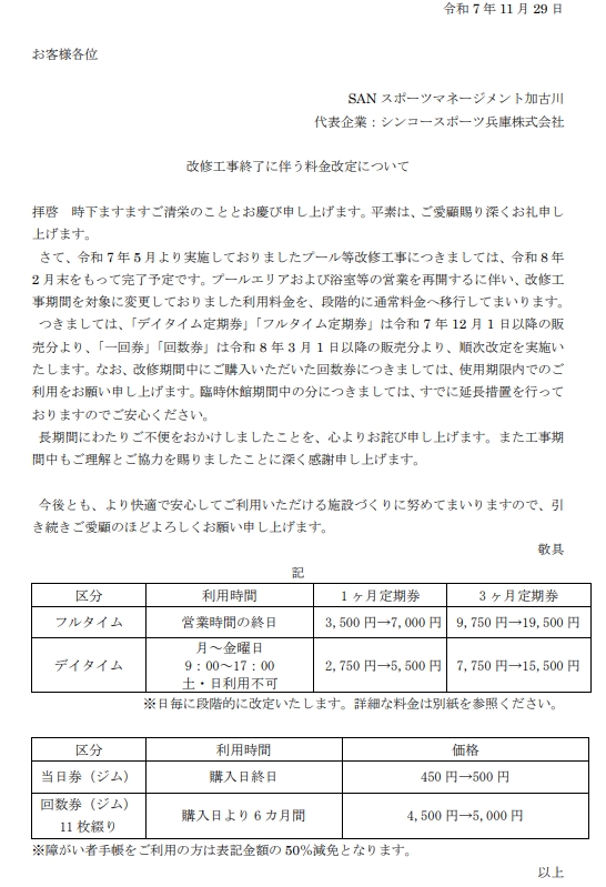 今後変更が出た際は館内掲示、ホームページ、Google、Instagramにて随時ご案内させていただきます。