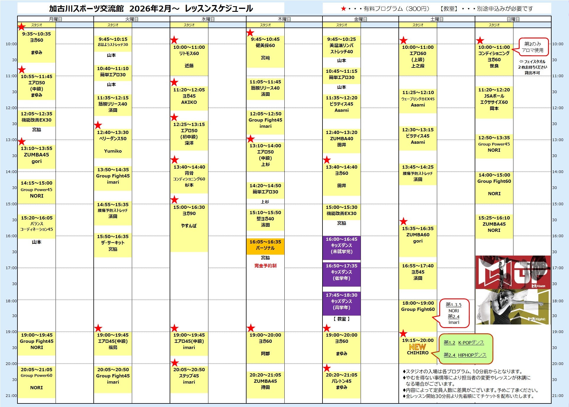 レッスンスケジュールに★マークがついているプログラムの参加は有料です。1階券売機にてウェルネスプログラムチケット(300円)をご購入ください。※定期券をお持ちの方は全スタジオレッスン無料です。