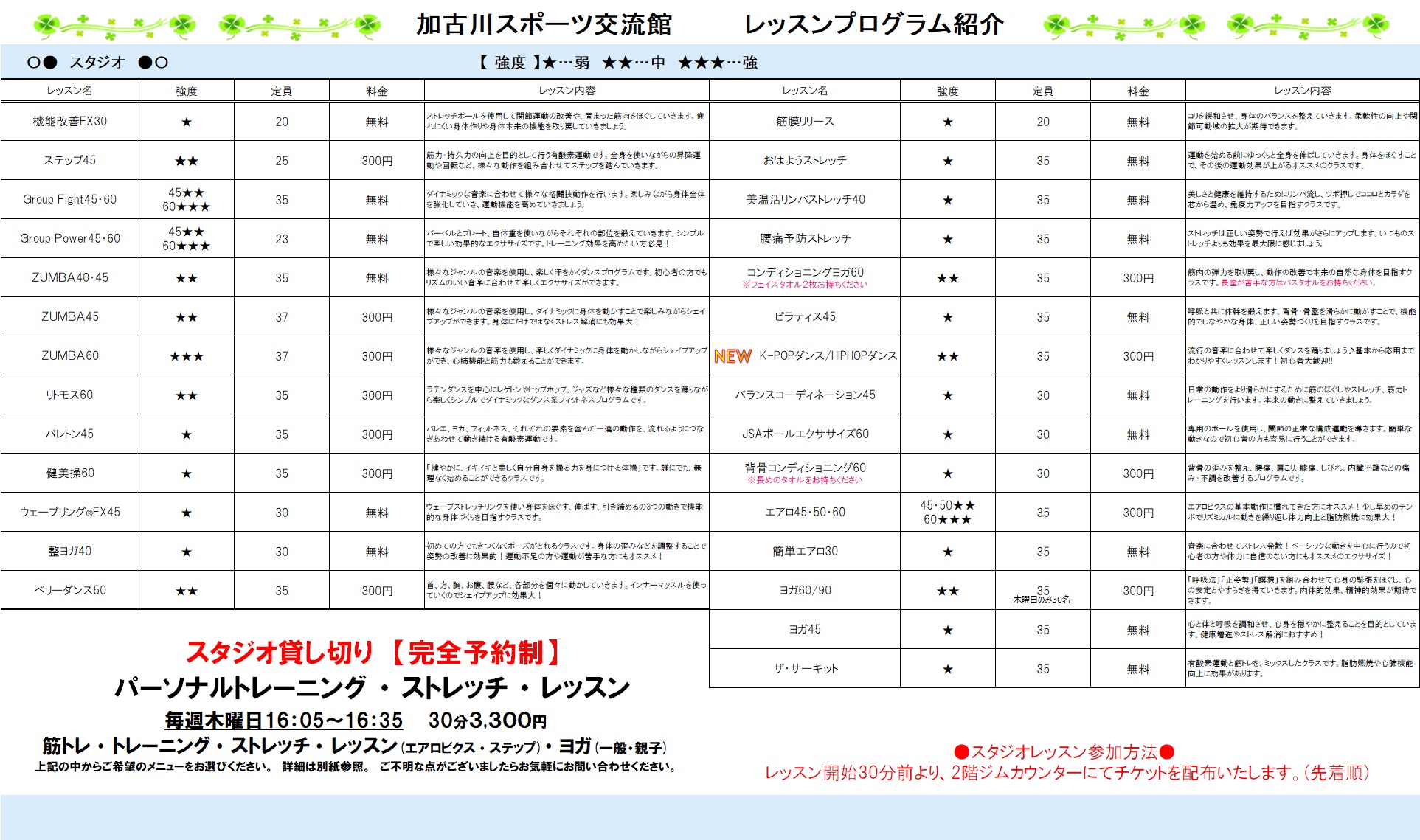 レッスンスケジュールに★マークがついているプログラムの参加は有料です。1階券売機にてウェルネスプログラムチケット(300円)をご購入ください。※定期券をお持ちの方は全スタジオレッスン無料です。
