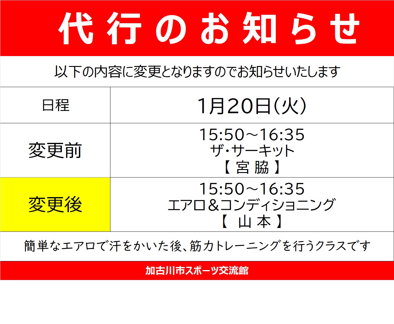 1/20(火)のプログラムが一部変更となりますので