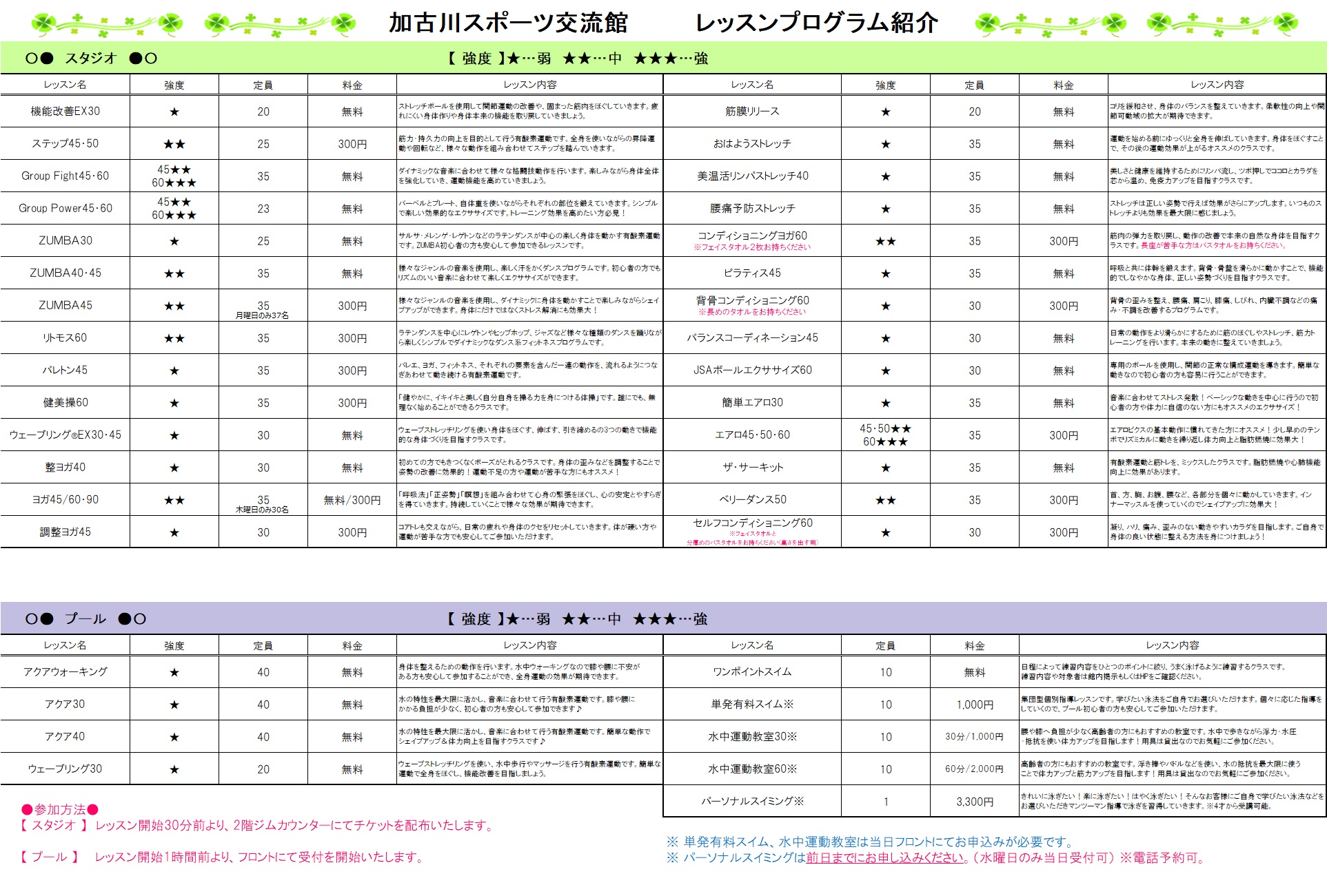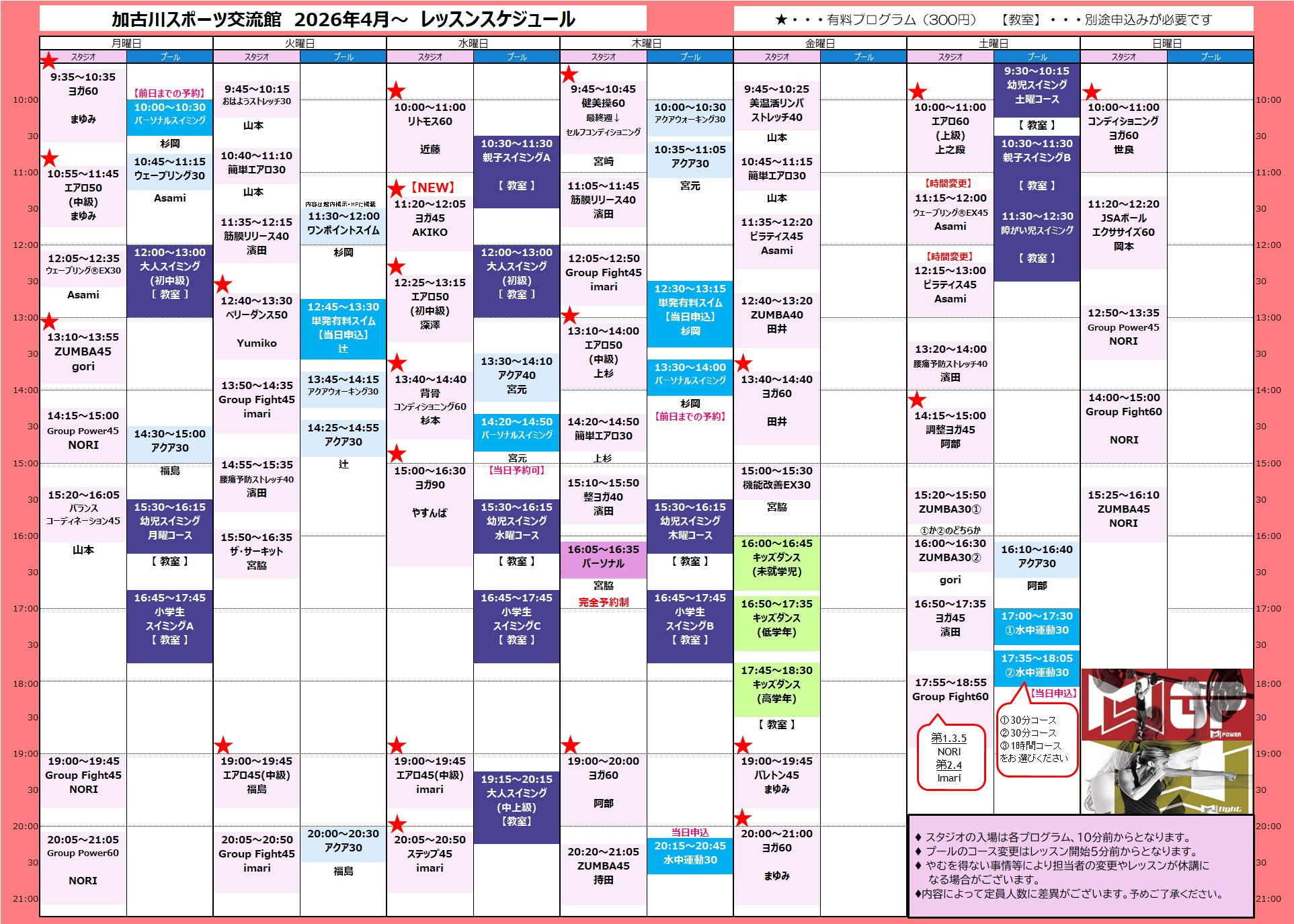 レッスンスケジュールに★マークがついているプログラムの参加は有料です。1階券売機にてウェルネスプログラムチケット(300円)をご購入ください。※定期券をお持ちの方は全スタジオレッスン無料です。