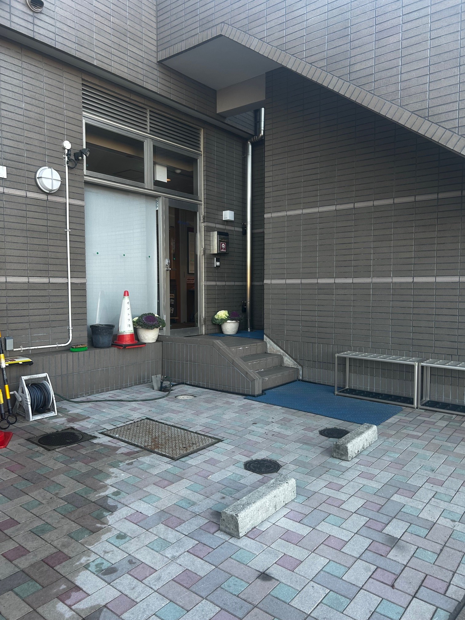施設出入口はこれまで通り裏口からとなります。これまでは神社側からお越しいただいておりましたが、今後は正面玄関側から裏口へお越しください。POPにて経路案内させていただいております。ご来館の際は順路に沿ってお越しくださいますようお願いいたします。