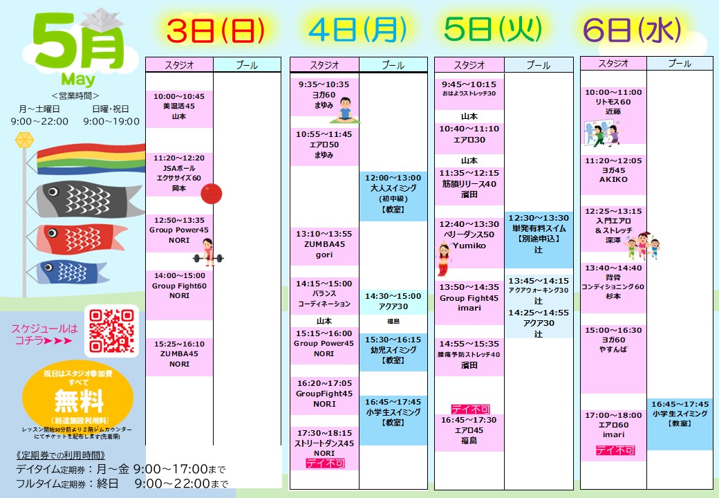 GW祝日プログラム 2026/04/23 5/3.4.5.6は9:00~19:00までの営業です。 ジム・プールエリアの利用は閉館10分前までとなります。 みなさまのご来館をお待ちしております✨ 当施設初めての方へのご案内 « 前のページに戻る