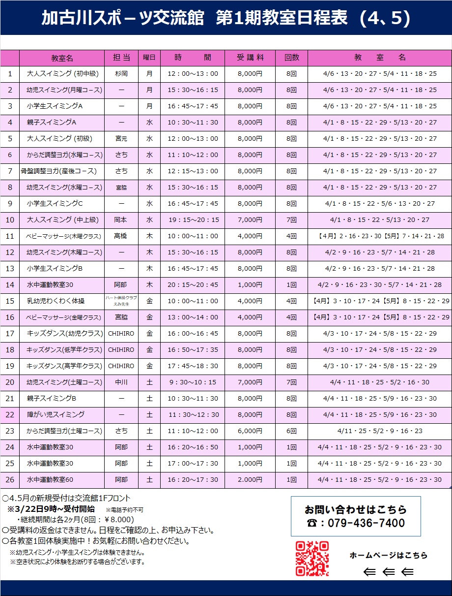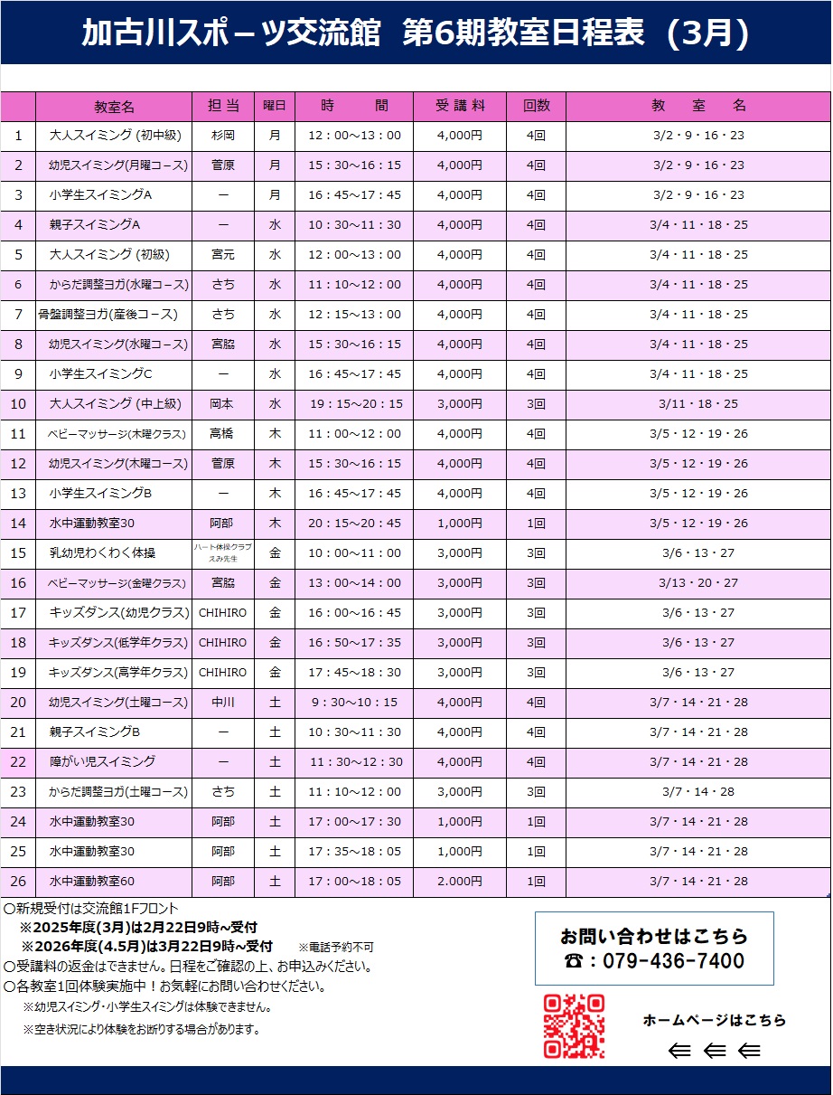 詳しくは下記教室日程表をご確認の上、スポーツ交流館にお問い合わせください。